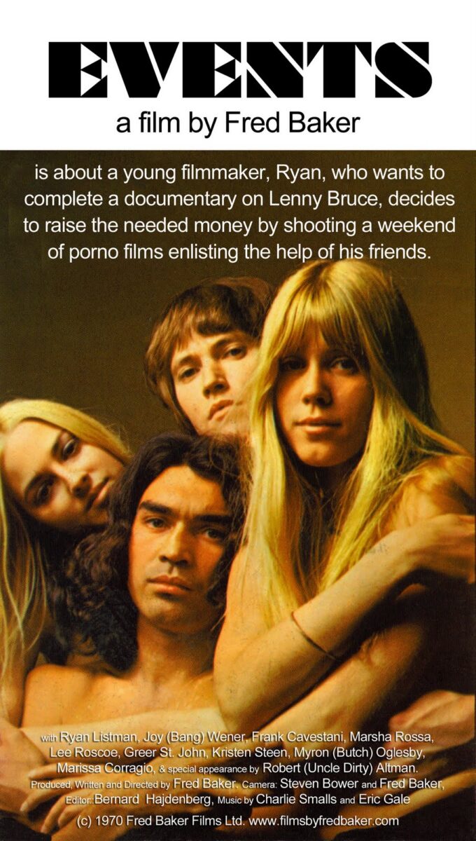 Fred Baker was an aspiring New York filmmaker whose side gig was making porno loops for a mobster named Spanish Louey. Convincing said mobster that he could pull off a legit film for equal profits, he borrowed $25K, at risk to his actual life and limbs, to make Events, a “totally improvised dramatic street feature”[iv] in which the actors would play a version of themselves while the self-reflexive script depicts a wannabe directing team turning to porn as a means of financing a documentary about Lenny Bruce.