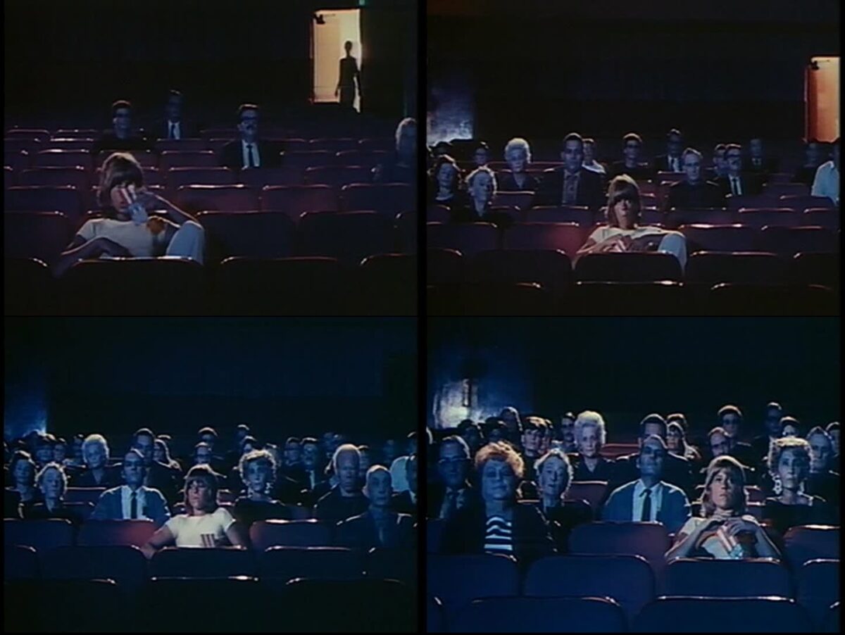Joy Bang in the classic movie theatre sequence of MESSIAH OF EVIL. Photo collage by horrormoviediary.net